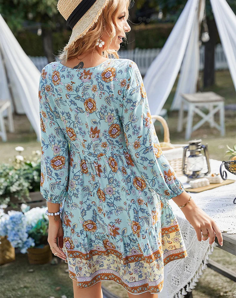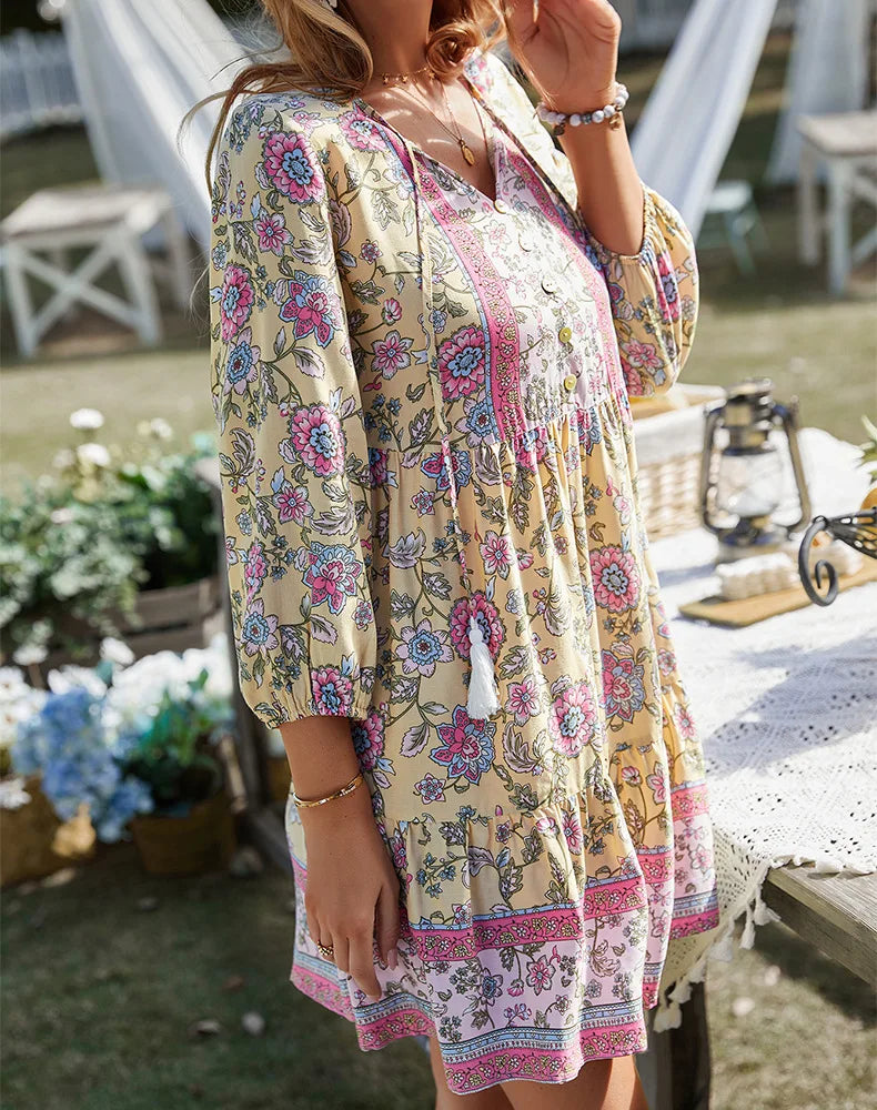 שמלה קיץ נוחה עם מחשוף V ושרוולים מלאים. עשויה כותנה ופוליאסטר, איכותית, עם הדפס מודפס ומותן טבעי. גזרה ישרה, אורך ברך, מושלמת לעונות אביב/קיץ.